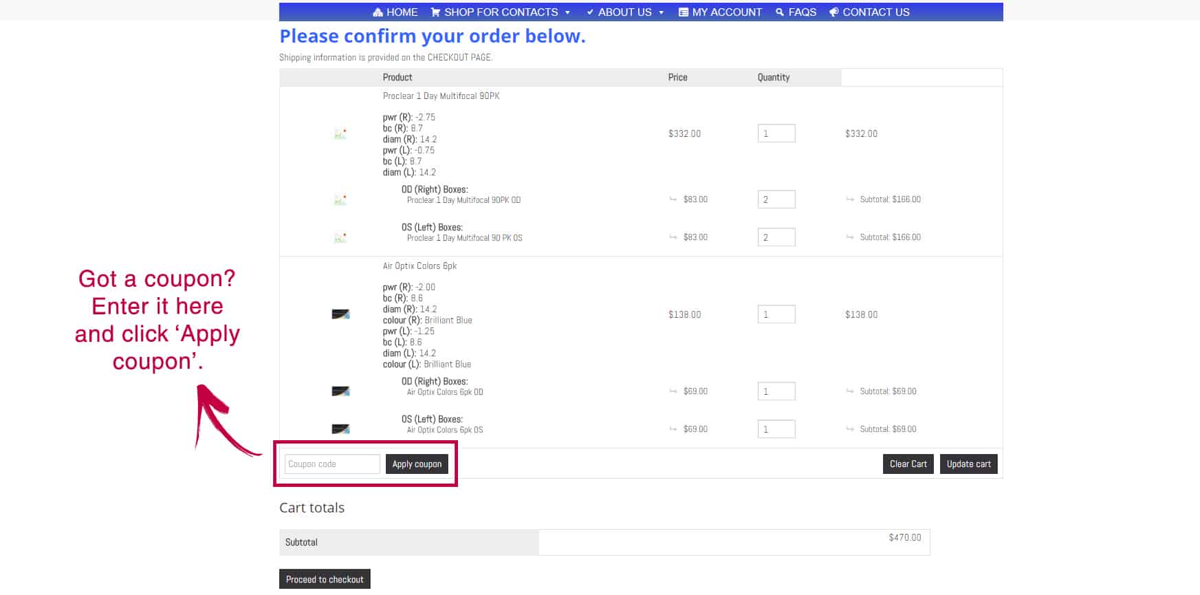 If you make any changes in the box quantity, click ‘Update Cart’ to see the new subtotal.